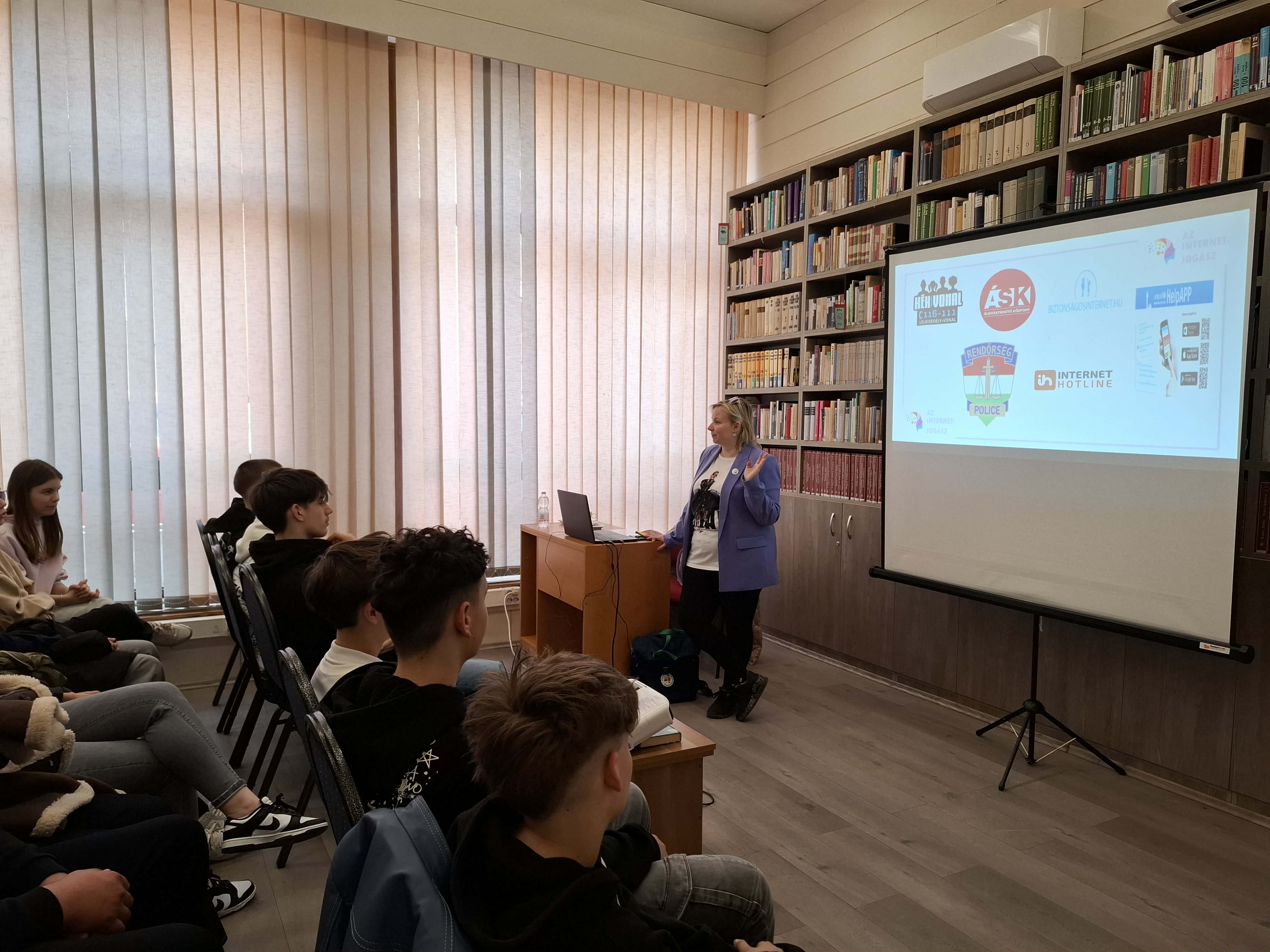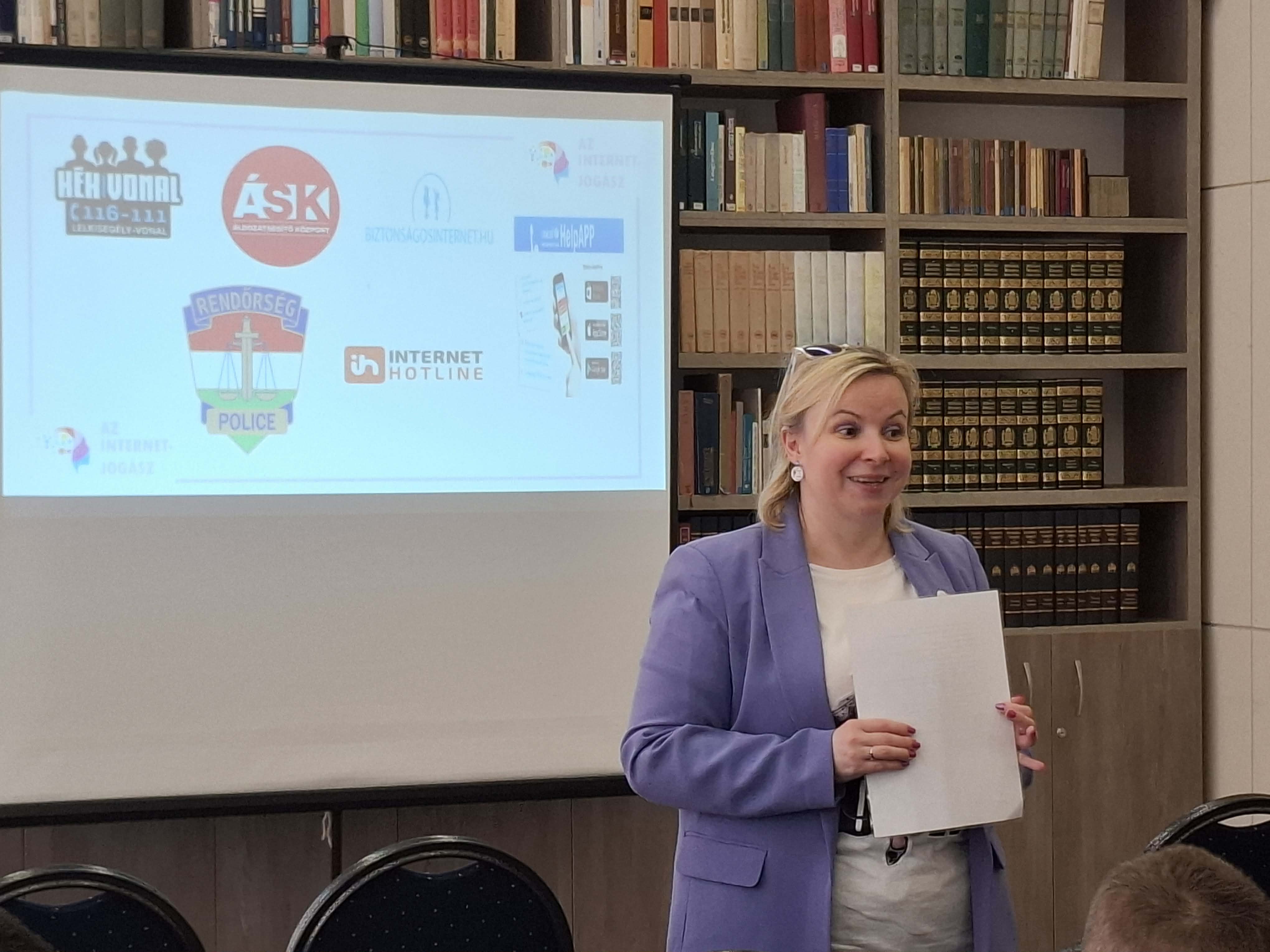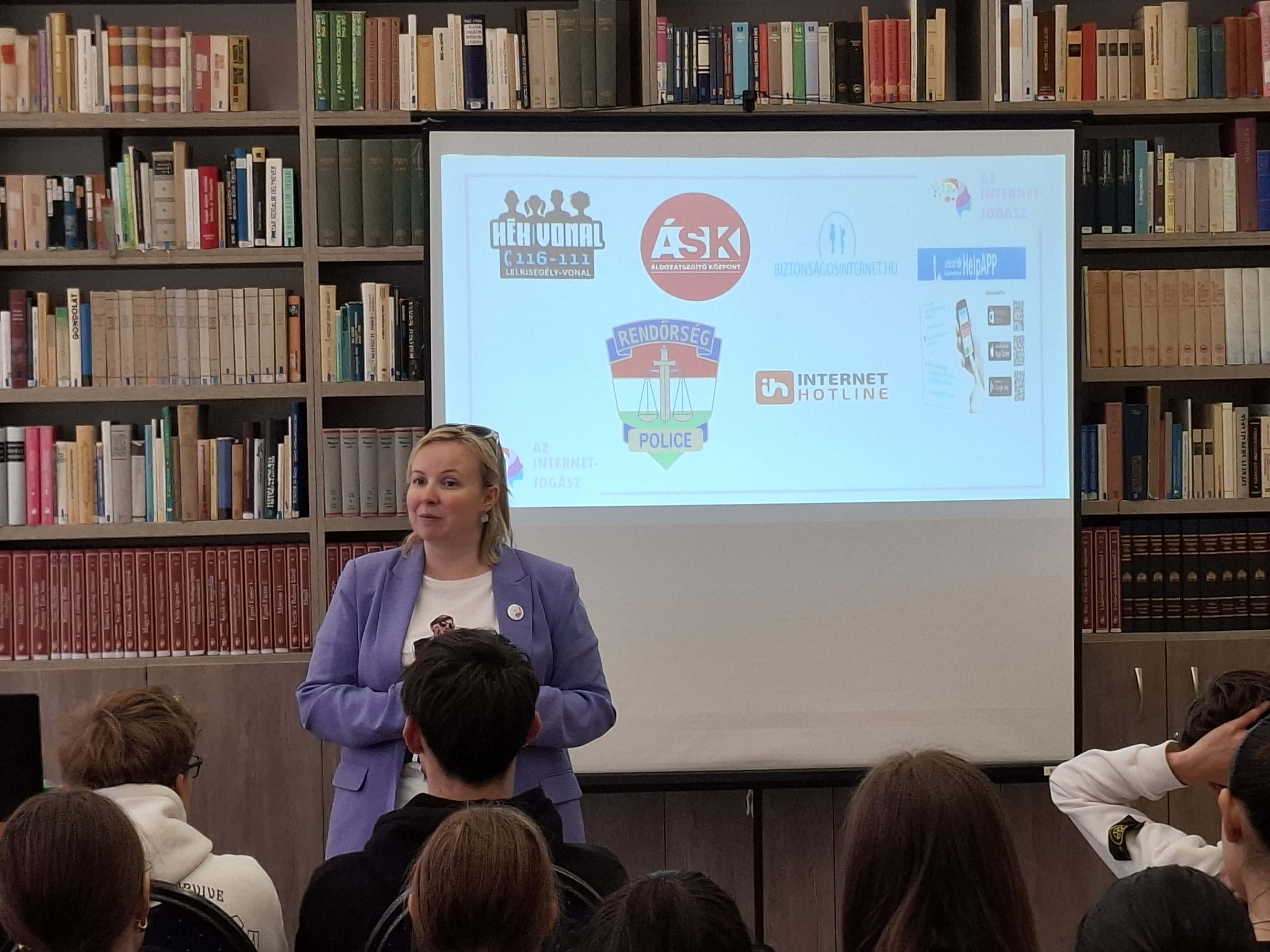 A programsorozat első napján, március 23-án Dr. Baracsi Katalin internetjogász volt a vendégünk, aki négy előadást tartott intézményünkben. Az első három alkalommal a 13–16 éves korosztály vett részt a „Digitális kalandok” című interaktív foglalkozáson. Az előadó a fiatalok internethasználati szokásairól beszélgetett a diákokkal, szó esett az online tér veszélyeiről, a tudatos és felelős internethasználatról, valamint a cyberbullying jelenségéről is. Emellett bemutatásra kerültek olyan szervezetek, amelyek segítséget nyújthatnak problémás helyzetekben.