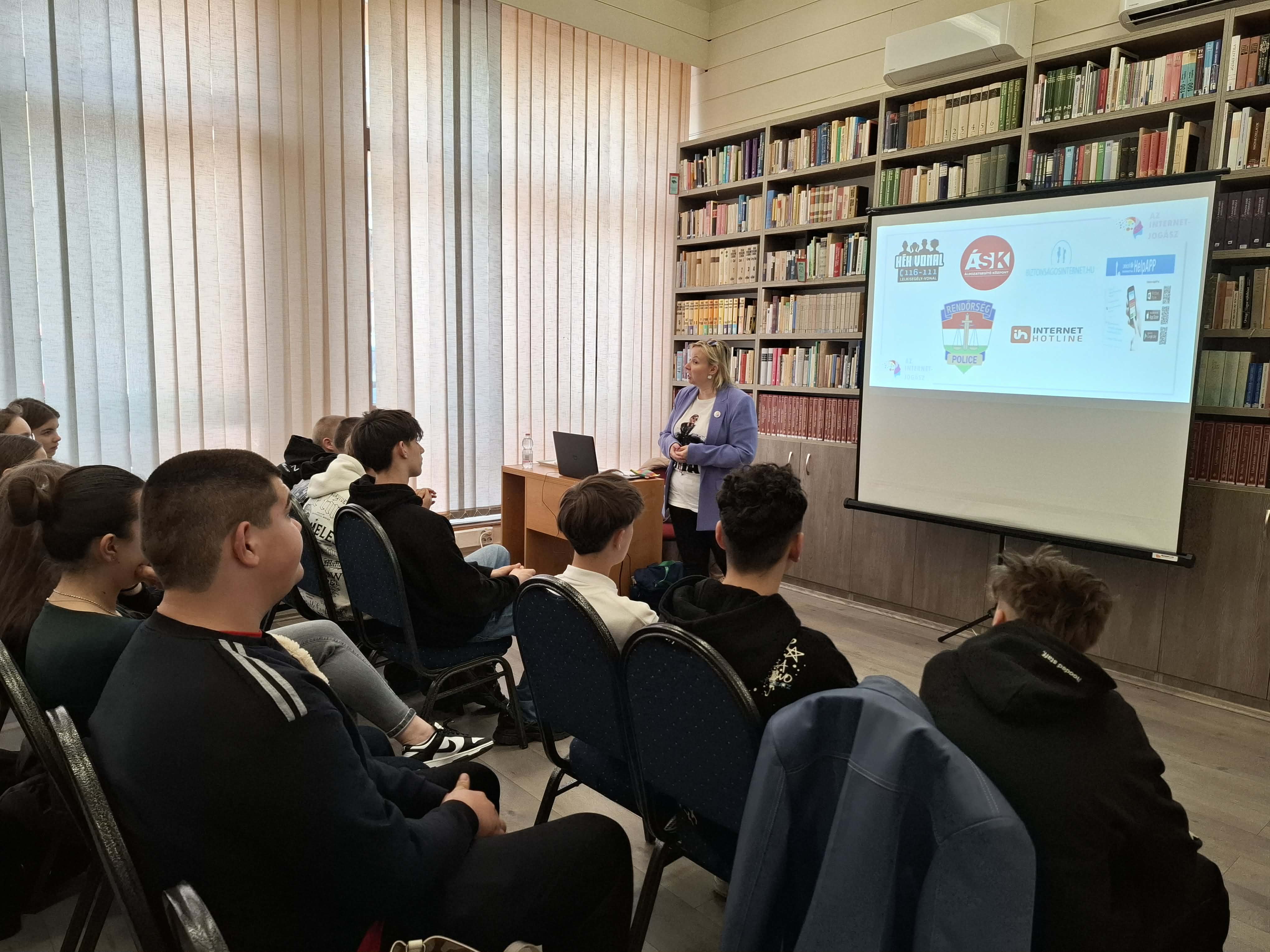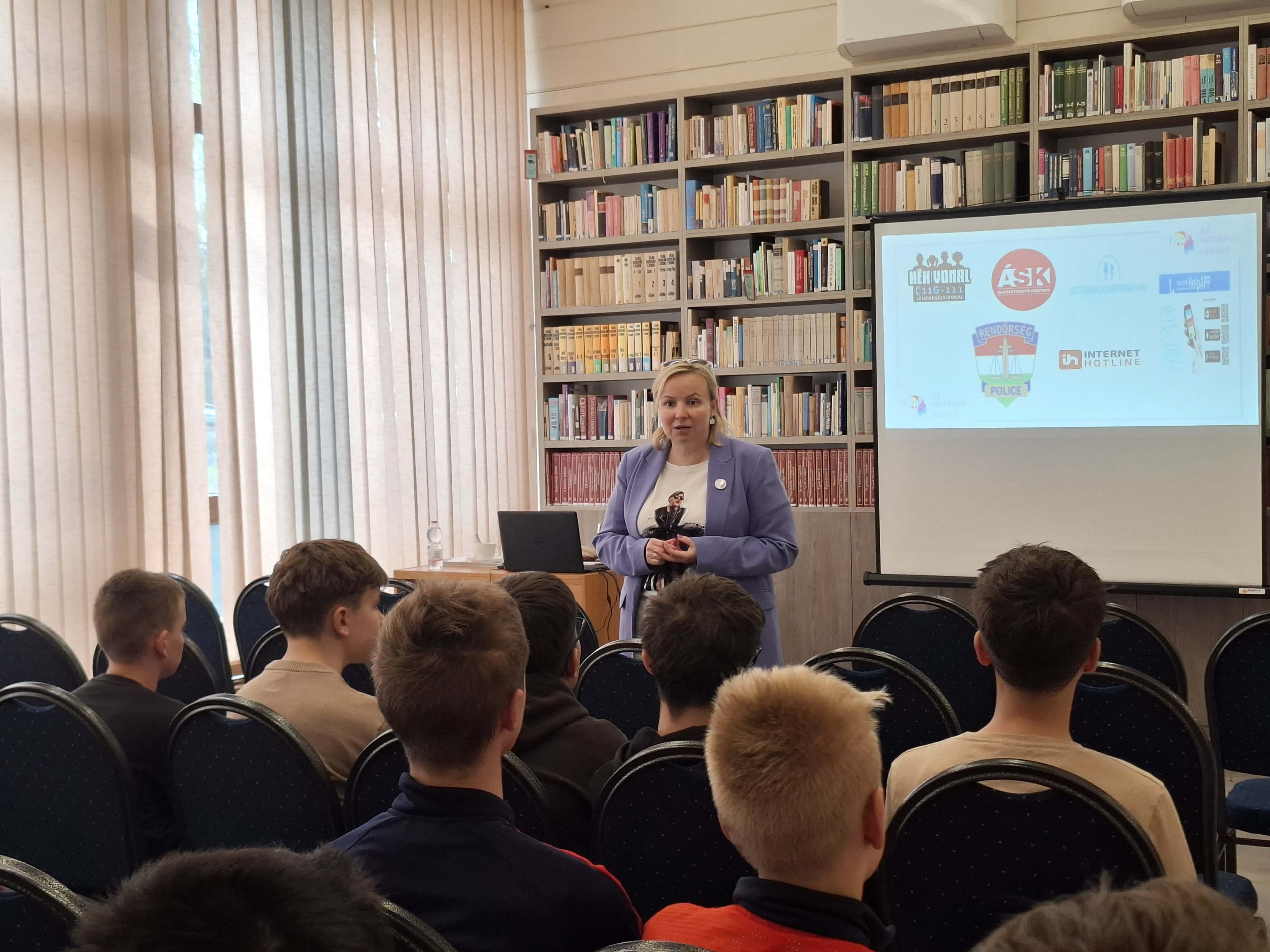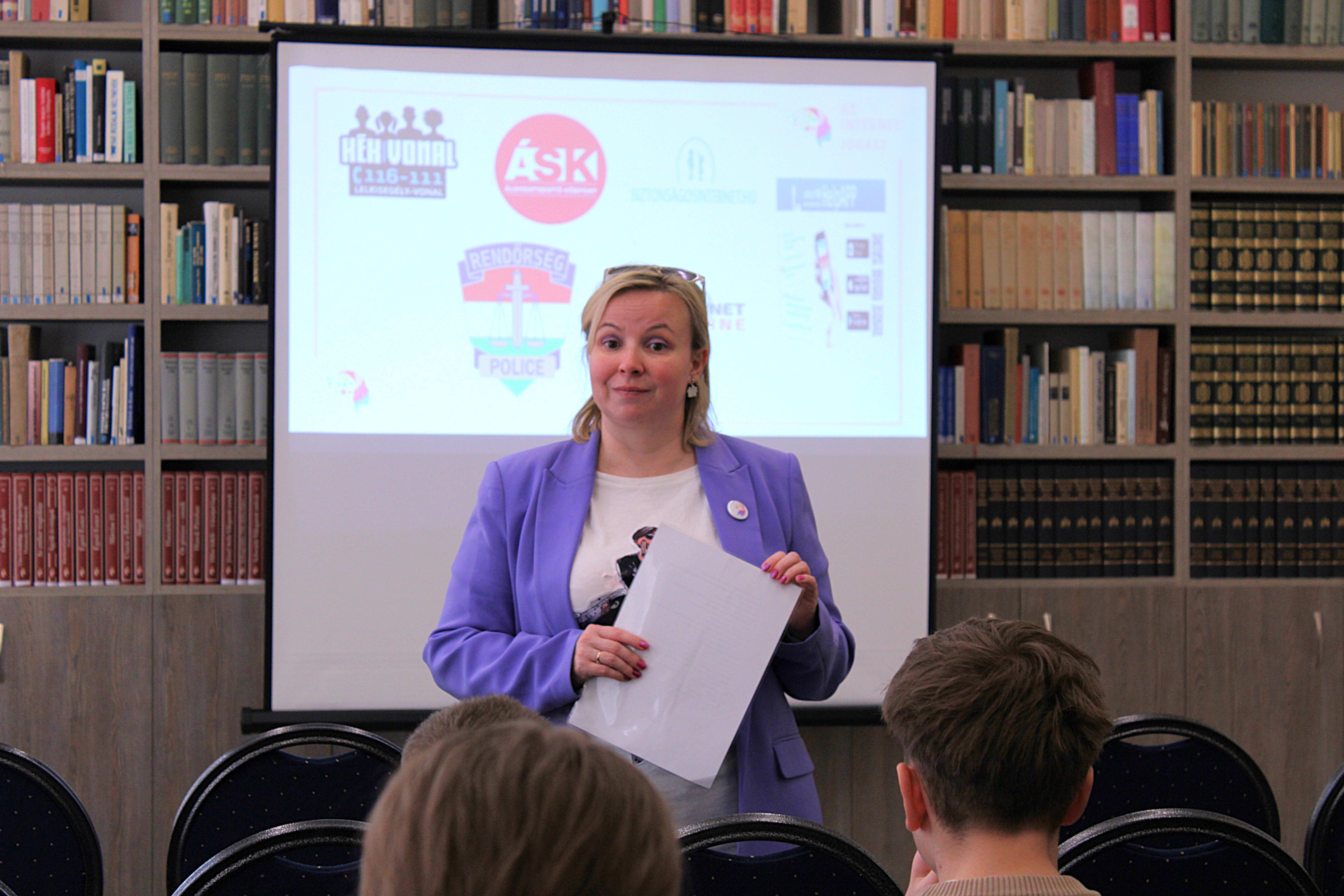 A programsorozat első napján, március 23-án Dr. Baracsi Katalin internetjogász volt a vendégünk, aki négy előadást tartott intézményünkben. Az első három alkalommal a 13–16 éves korosztály vett részt a „Digitális kalandok” című interaktív foglalkozáson. Az előadó a fiatalok internethasználati szokásairól beszélgetett a diákokkal, szó esett az online tér veszélyeiről, a tudatos és felelős internethasználatról, valamint a cyberbullying jelenségéről is. Emellett bemutatásra kerültek olyan szervezetek, amelyek segítséget nyújthatnak problémás helyzetekben.