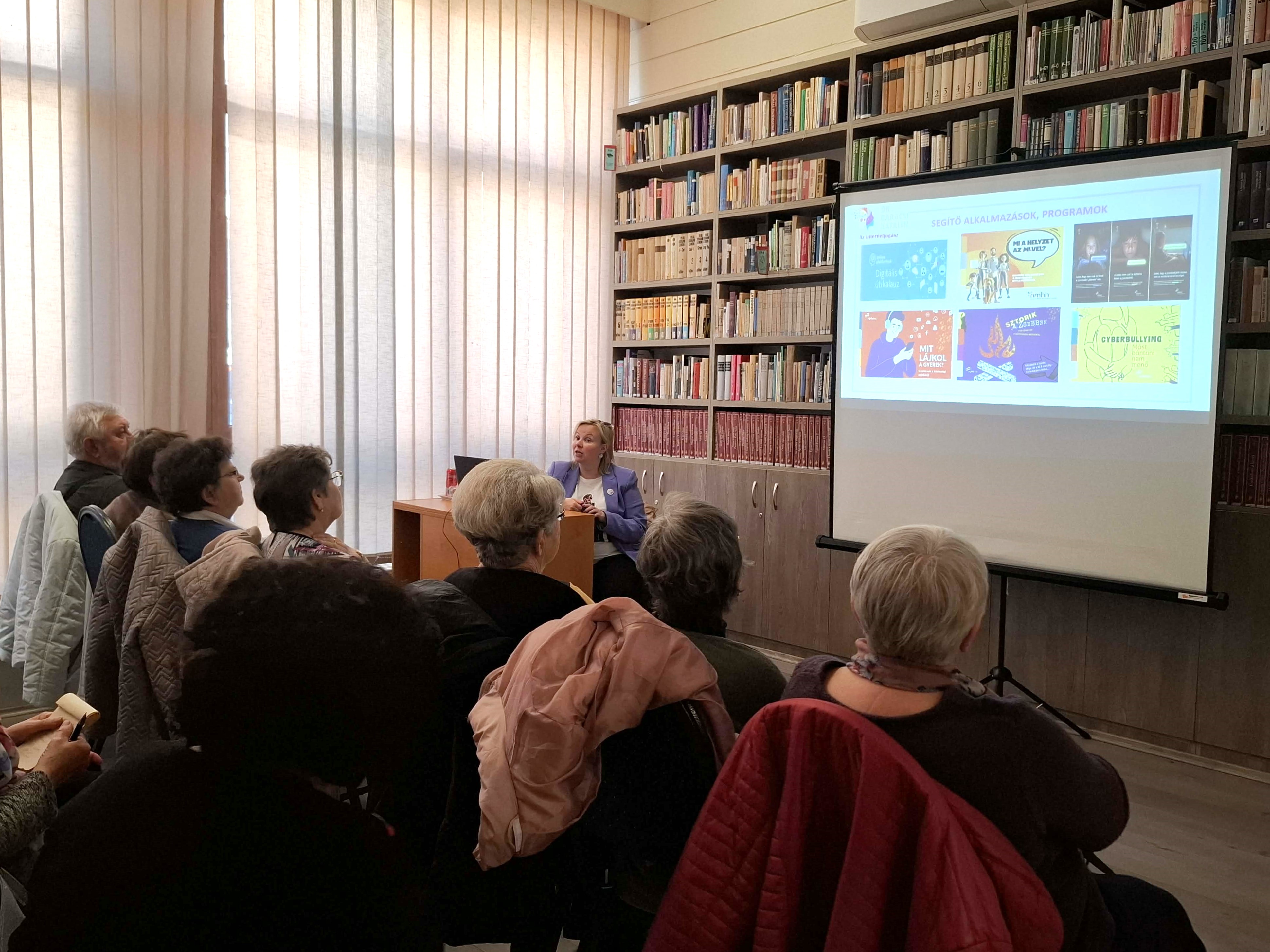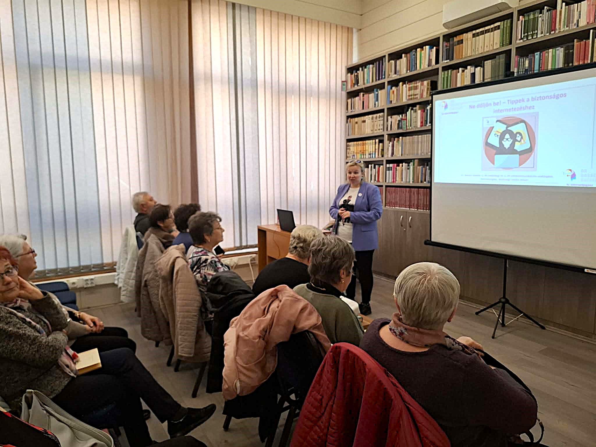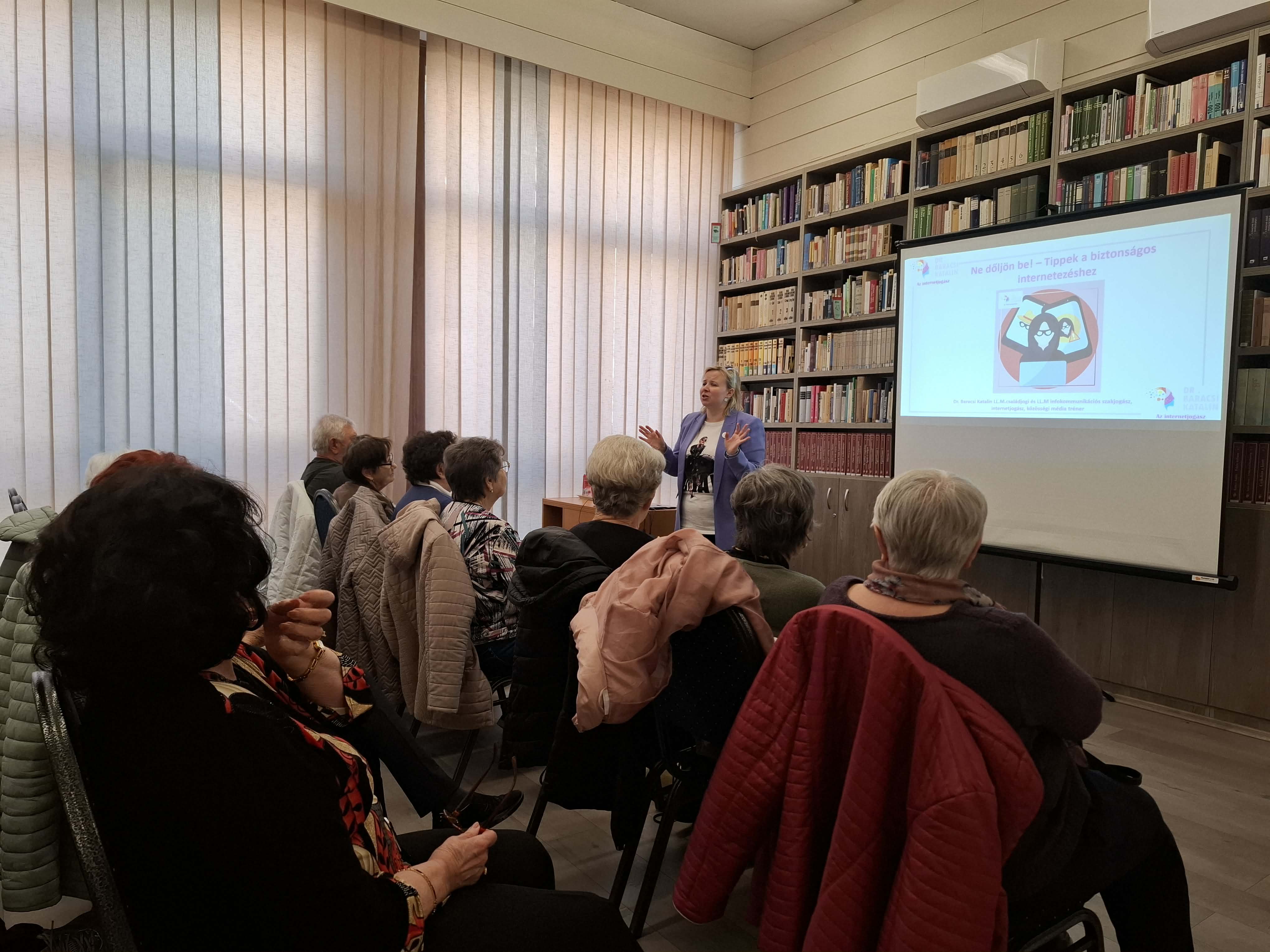 A délutáni órákban vendégünk a senior korosztály számára „Ne dőljön be! - Tippek a biztonságos internetezéshez” címmel tartott előadást, ahol valós példákon keresztül, közérthető módon ismertette az online visszaélések leggyakoribb formáit, és hasznos tanácsokat adott arra vonatkozóan, mire érdemes figyelni, illetve hogyan lehet elkerülni a veszélyes helyzeteket. Az előadás során a résztvevők saját internethasználati tapasztalataikat is megoszthatták.