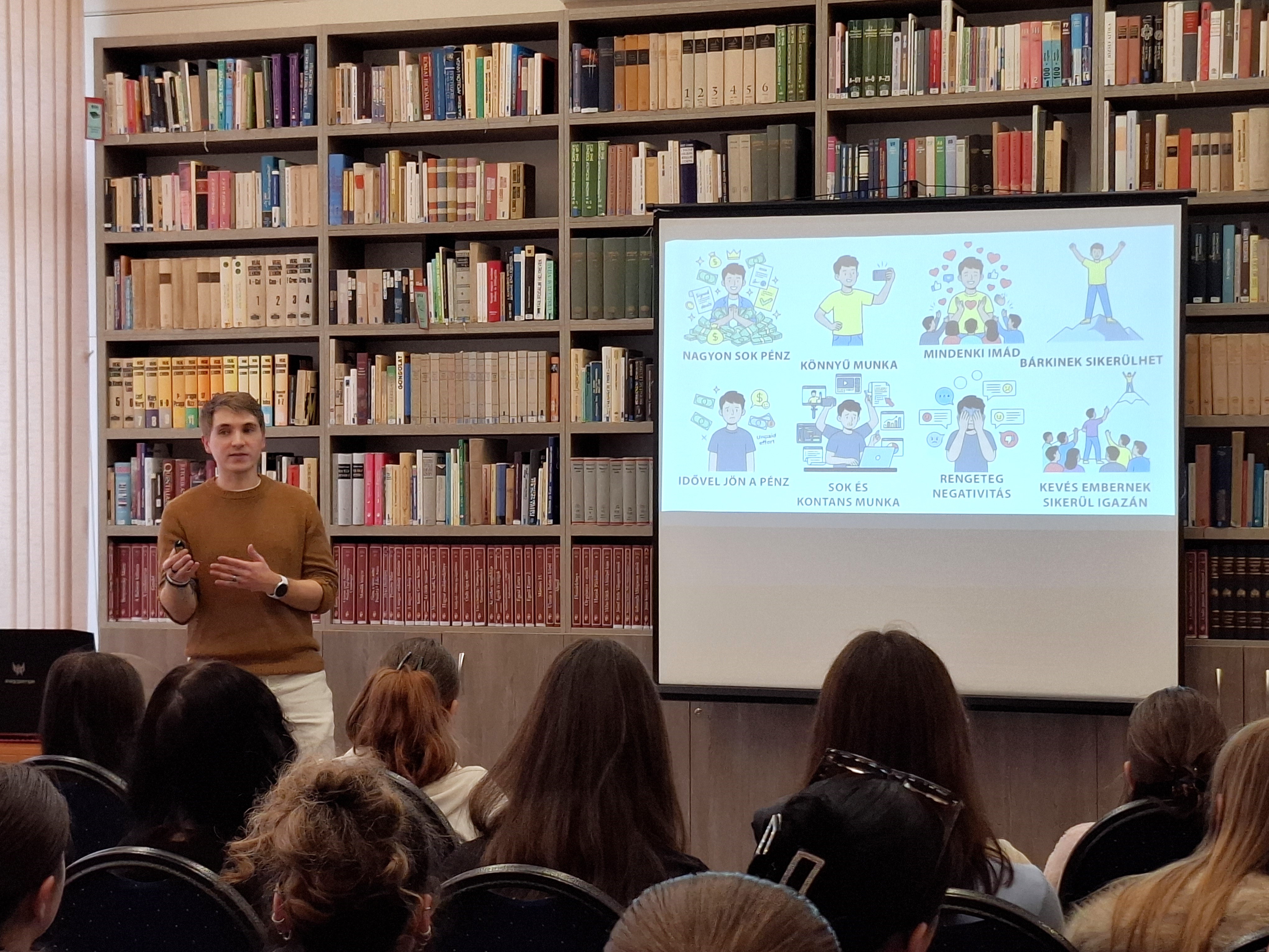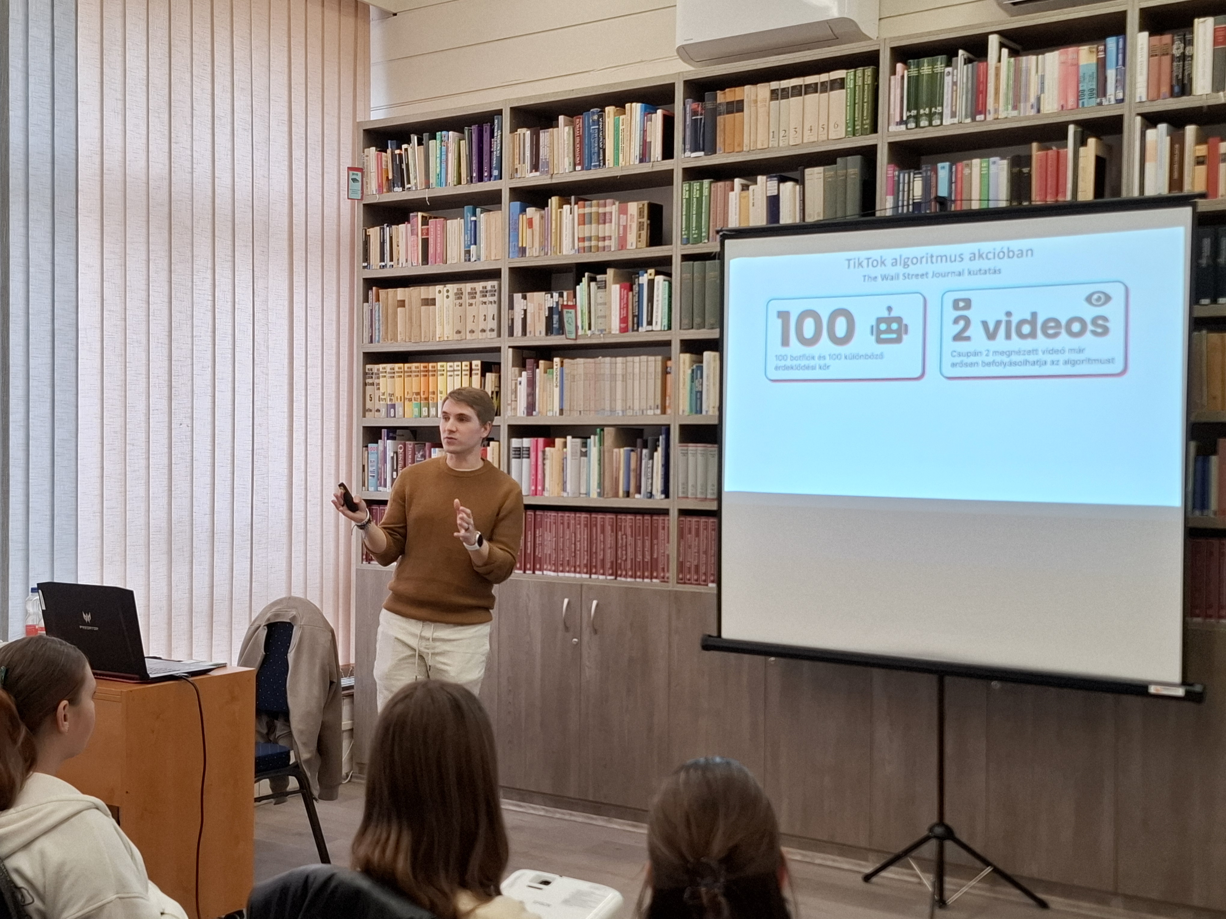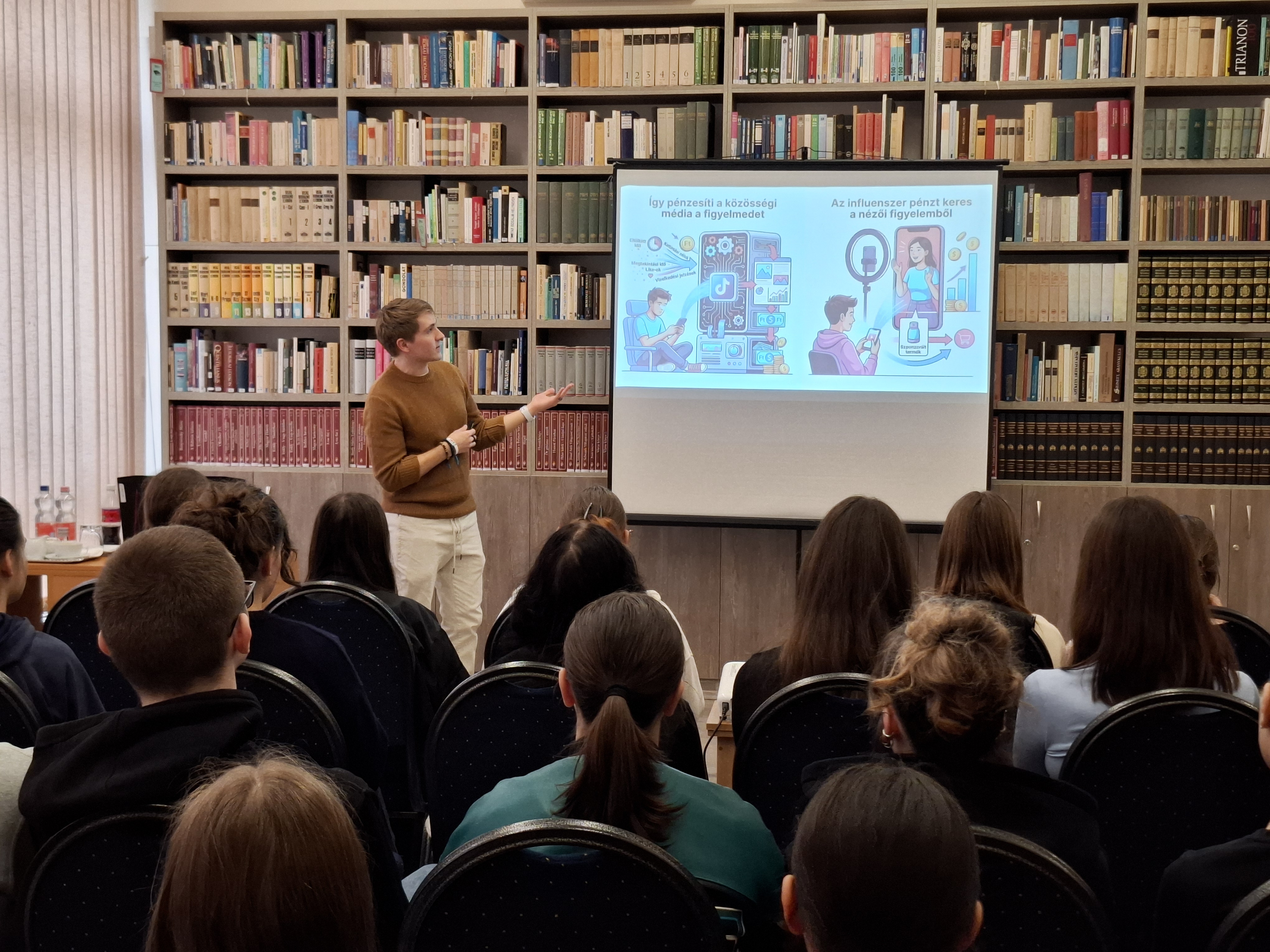 Március 26-án délután az ismert Tanulom magam YouTube-csatorna készítője, Dóczi Attila volt a vendégünk. „Te használod a TikTok-ot, vagy ő használ téged? – Minden, amit a For You-d eltitkol előled” című, gondolatébresztő bemutatójában közérthetően mutatta be a közösségi oldalak működését és hatásait. Előadásában kiemelte, hogy a felhasználóknak érdemes tudatosabban használniuk a digitális eszközöket és az online világ adta lehetőségeket. Ehhez hasznos gyakorlati tanácsokat is adott. Saját tapasztalatait megosztva a tartalomgyártás előnyeiről és árnyoldalairól is őszintén beszélt.