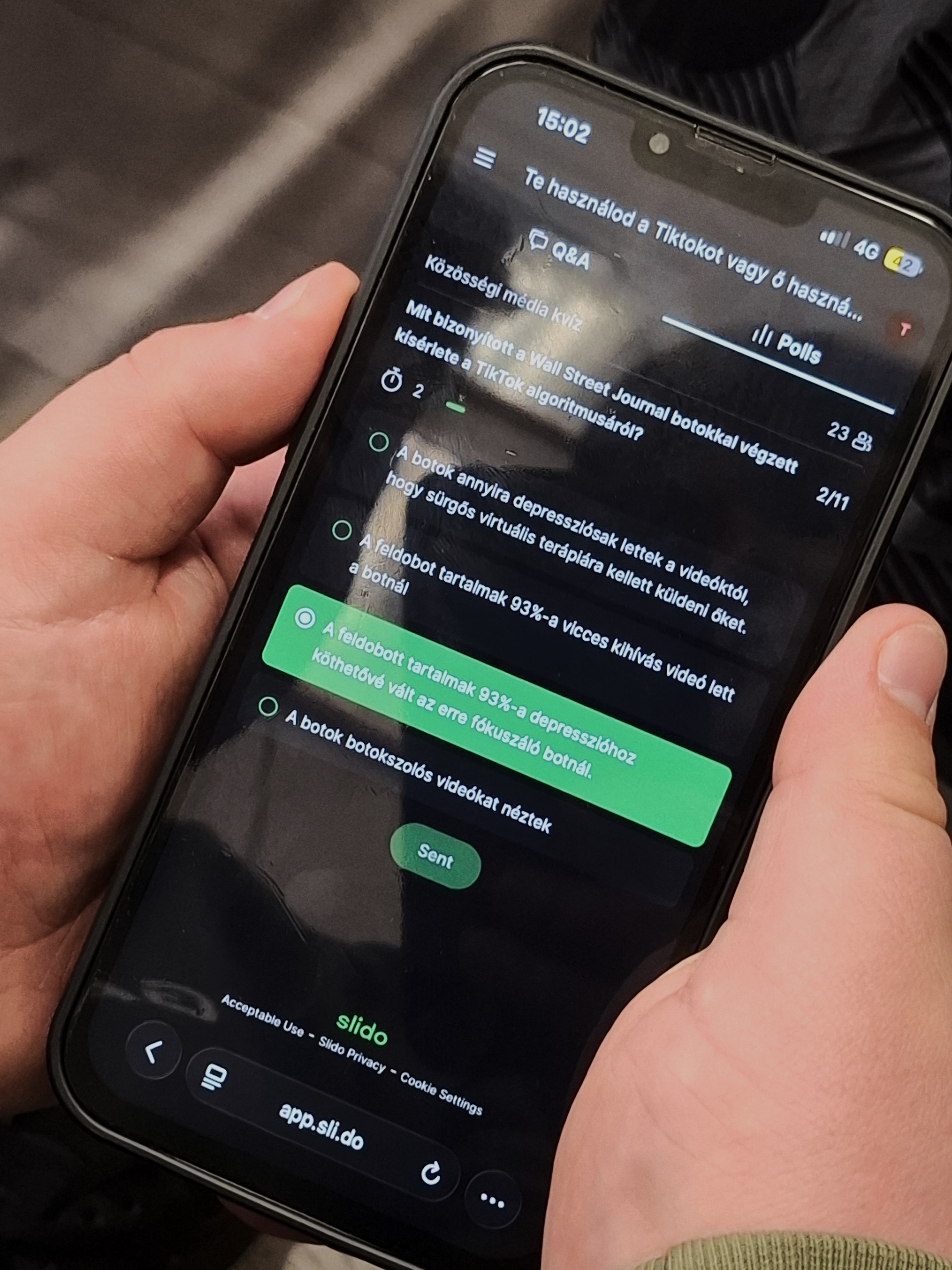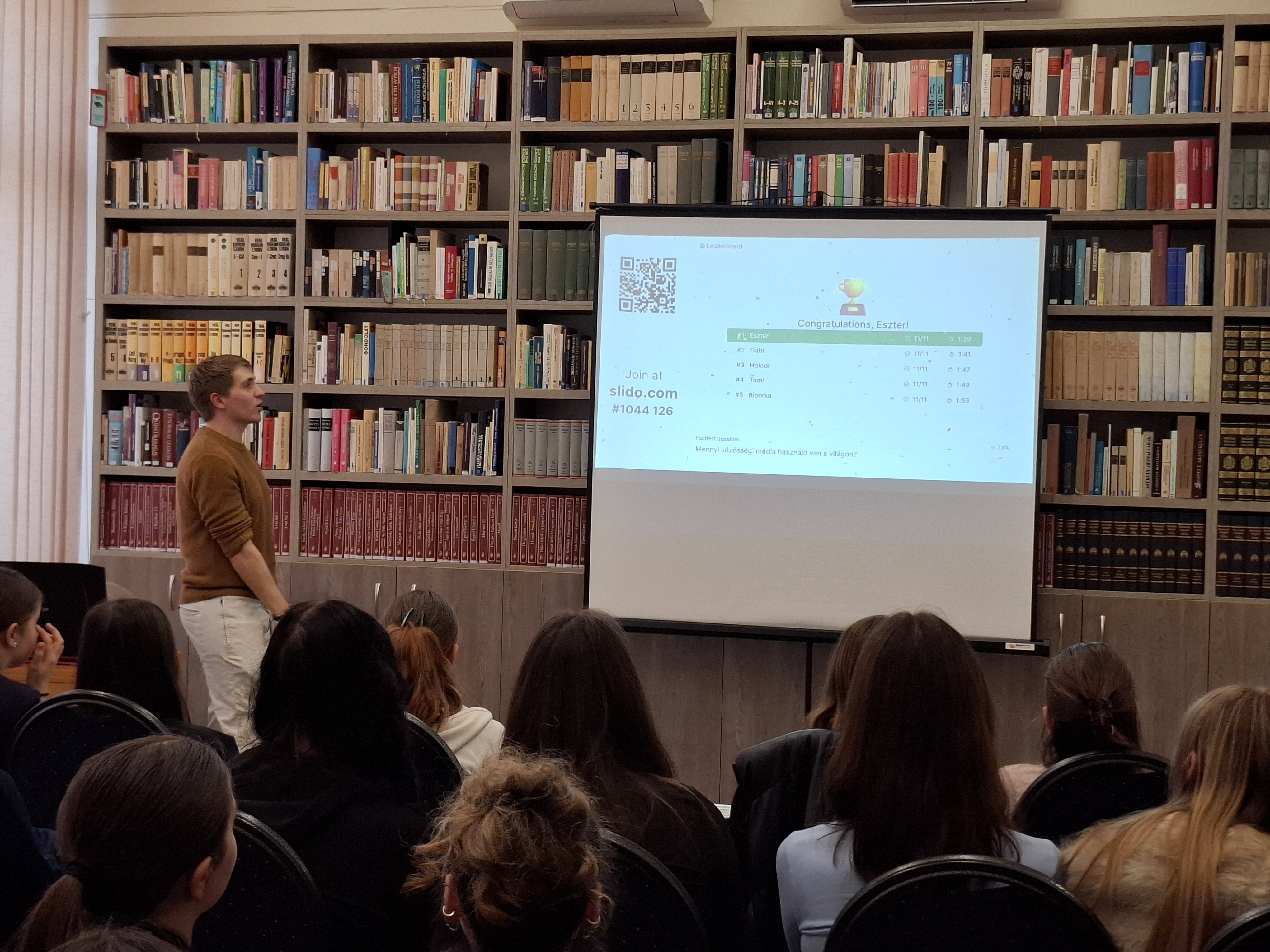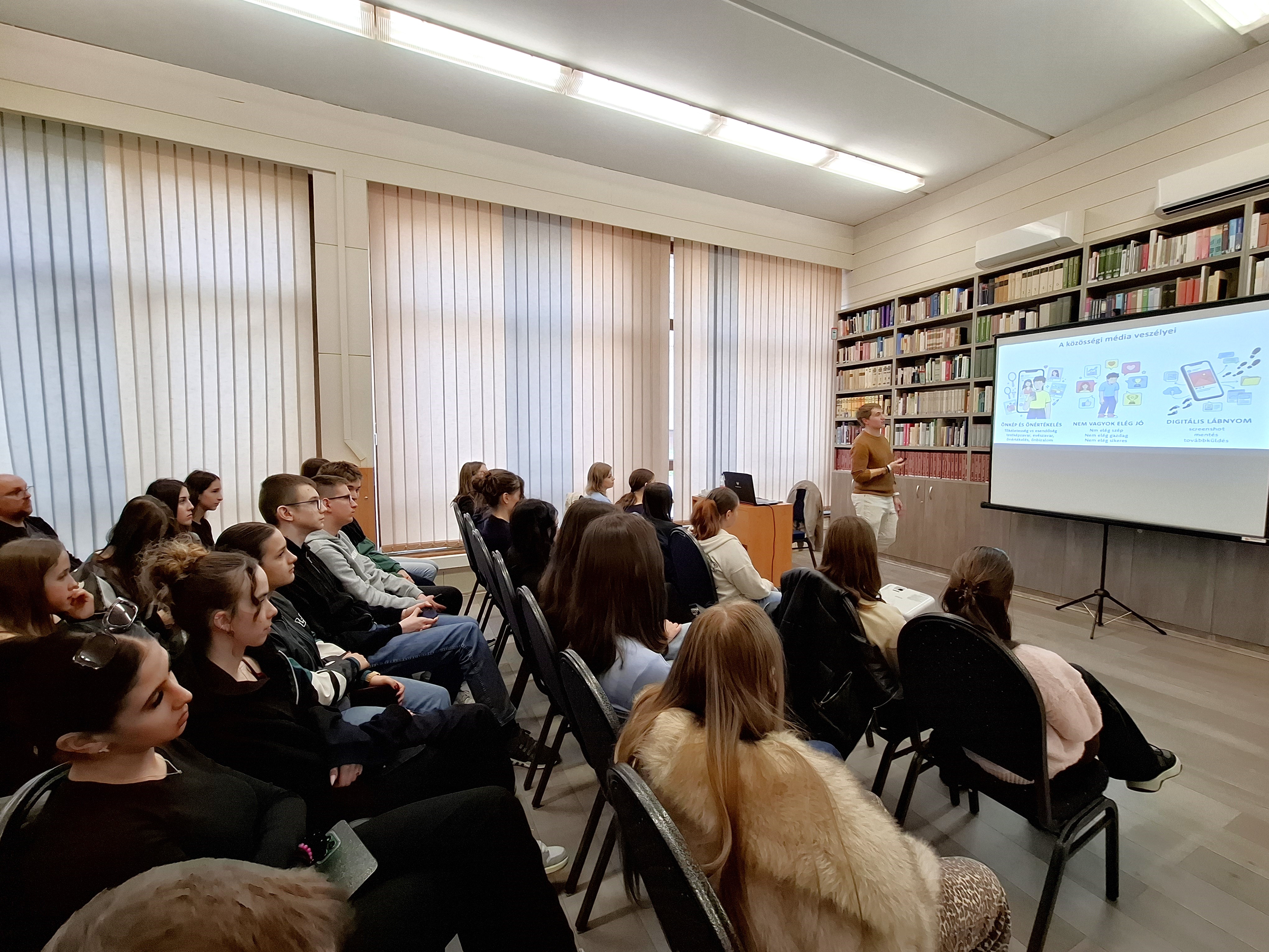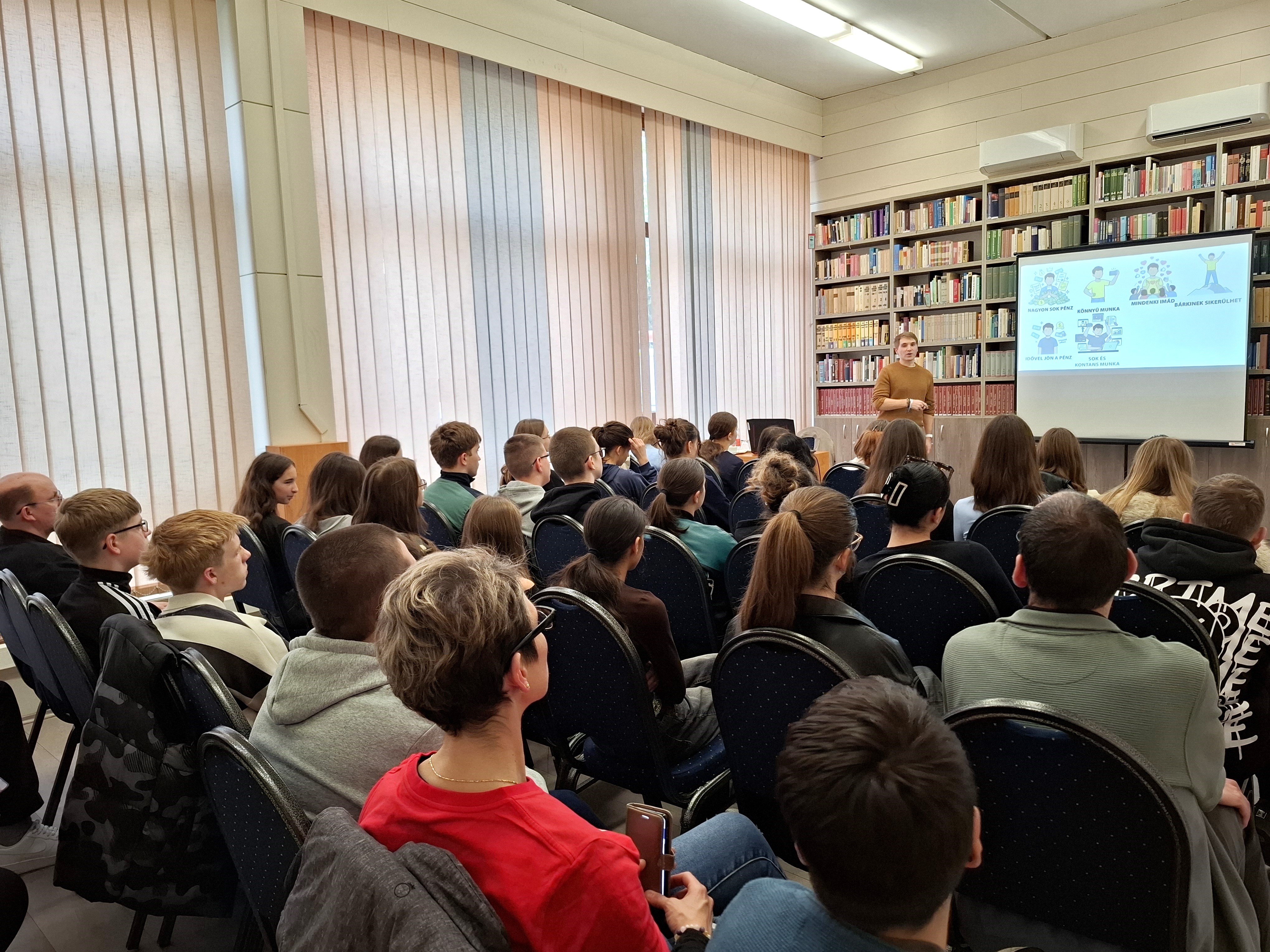 Március 26-án délután az ismert Tanulom magam YouTube-csatorna készítője, Dóczi Attila volt a vendégünk. „Te használod a TikTok-ot, vagy ő használ téged? – Minden, amit a For You-d eltitkol előled” című, gondolatébresztő bemutatójában közérthetően mutatta be a közösségi oldalak működését és hatásait. Előadásában kiemelte, hogy a felhasználóknak érdemes tudatosabban használniuk a digitális eszközöket és az online világ adta lehetőségeket. Ehhez hasznos gyakorlati tanácsokat is adott. Saját tapasztalatait megosztva a tartalomgyártás előnyeiről és árnyoldalairól is őszintén beszélt.